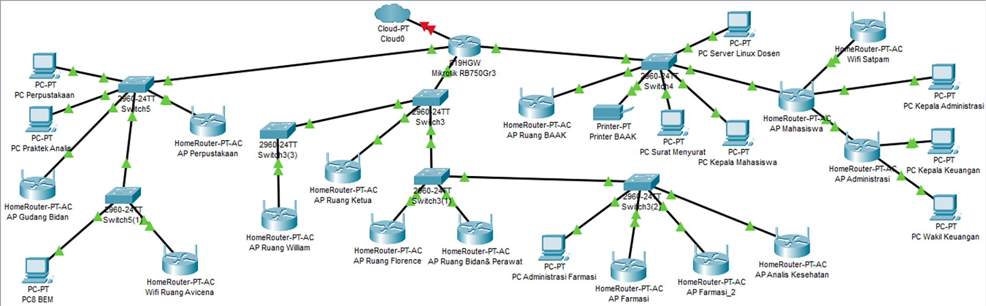 sampai membuat routing jaringan perkabelan, managementnya menggunakan Mikrotik RB750Gr3.